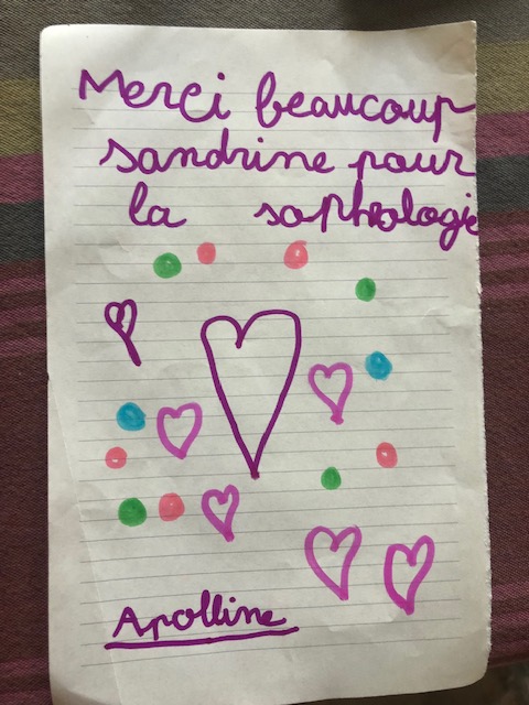 Partage d’un Merci lors d’une séance de sophrologie. J’aimerais tellement pouvoir enregistrer les retours des enfants afin de montrer les bienfaits sur leur développement personnel et émotionnel.